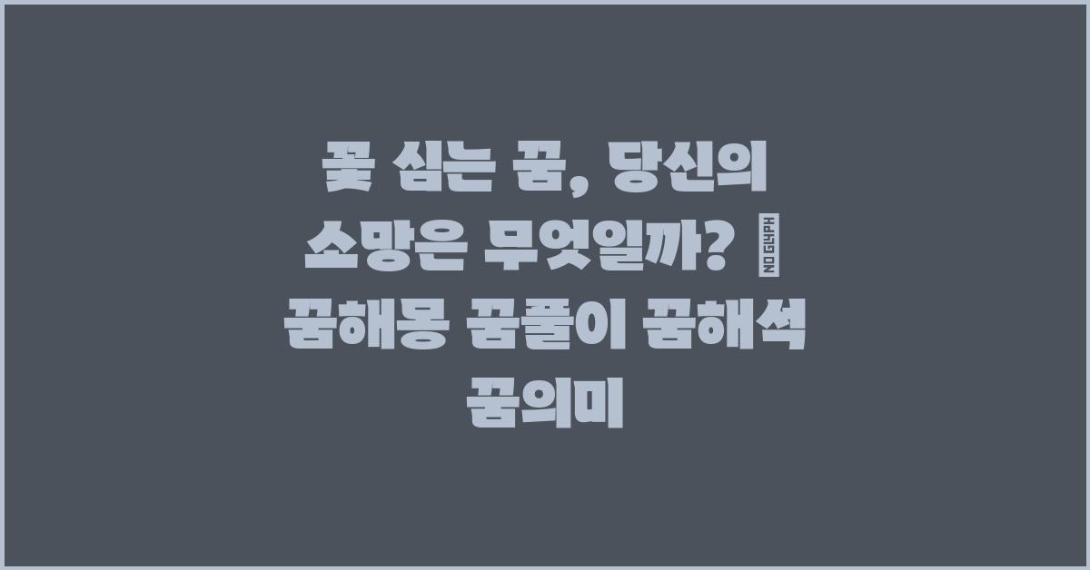 꿈은 종종 우리의 무의식을 반영합니다. 꽃 심는 꿈, 당신의 마음속 소망은? | 꿈해몽 꿈풀이 꿈해석 꿈의미를 살펴보면, 이는 내면의 목소리에 귀 기울이라는 경고일 수 있습니다. 여러분은 무엇을 진정으로 원하고 있는가요? 무언가 뿌리를 내리길 바라는지, 아니면 삶의 새로운 방향으로 나아가고자 하는지 고민해 보세요.