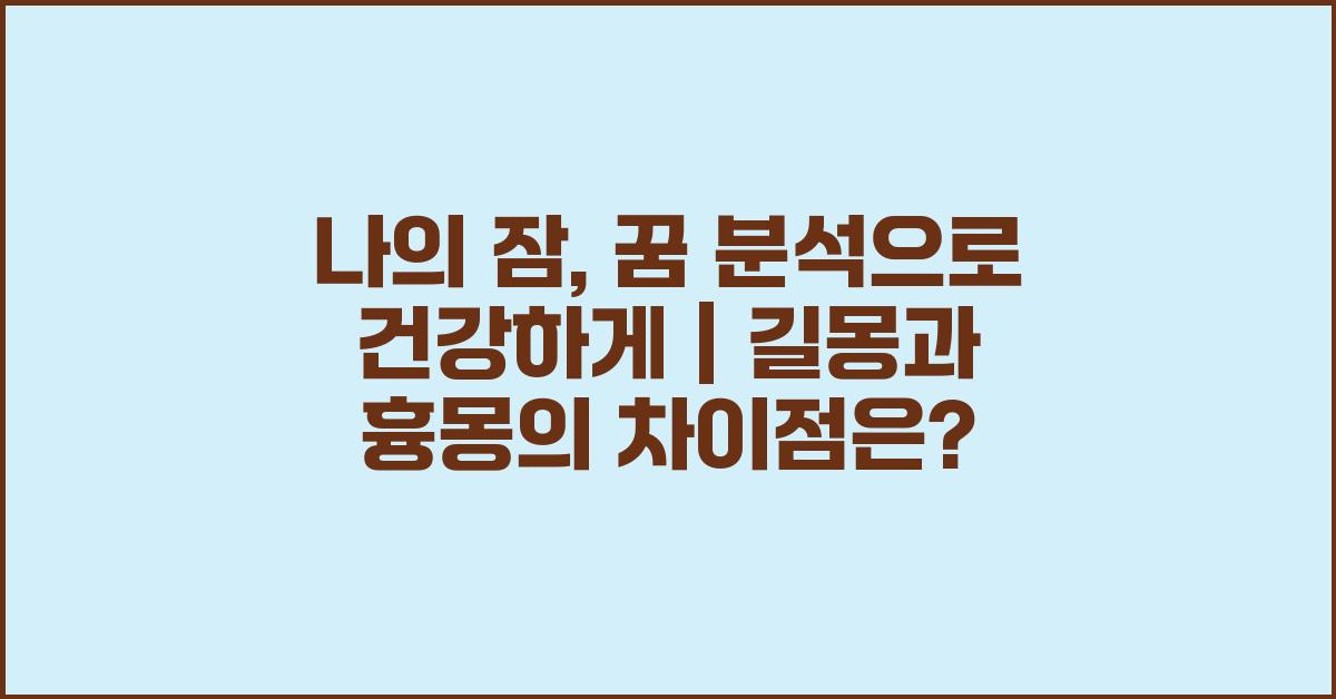 우리가 꿈을 꿀 때, 그 꿈은 길몽이거나 흉몽일 수 있습니다. 길몽은 좋은 기운을 가져다주는 꿈으로, 일반적으로 긍정적인 변화를 암시합니다. 반면에, 흉몽은 불안한 감정이나 부정적인 사건을 암시하는 꿈입니다. 여기에 대한 분석과 이해는 나의 잠, 꿈 분석으로 건강하게 일상에서의 감정 관리를 도와줄 수 있습니다.