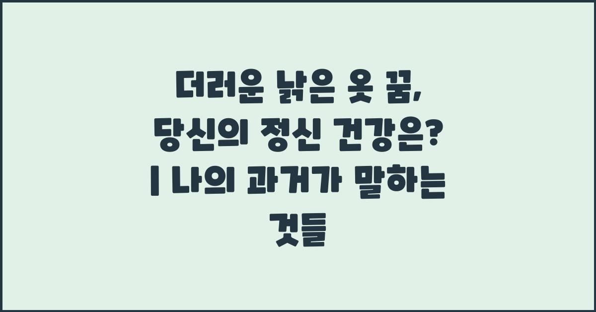 꿈은 우리 마음의 깊은 곳에서 나오는 신호로 여겨지곤 합니다. 특히, 더러운 낡은 옷 꿈은 허무함, 과거의 상처, 그리고 현재의 정신 상태를 반영하는 경우가 많습니다. 여러분도 이러한 꿈을 꾼 경험이 있으신가요? 어느 날 아침, 느닷없이 생각나서 깨어났을 때, 그 뒷맛이 무척이나 씁쓸했던 기억이 납니다. 늘어난 실밥이나 얼룩이 가득한 그 옷은 마치 저의 불안정한 감정을 상징하는 것 같았죠.