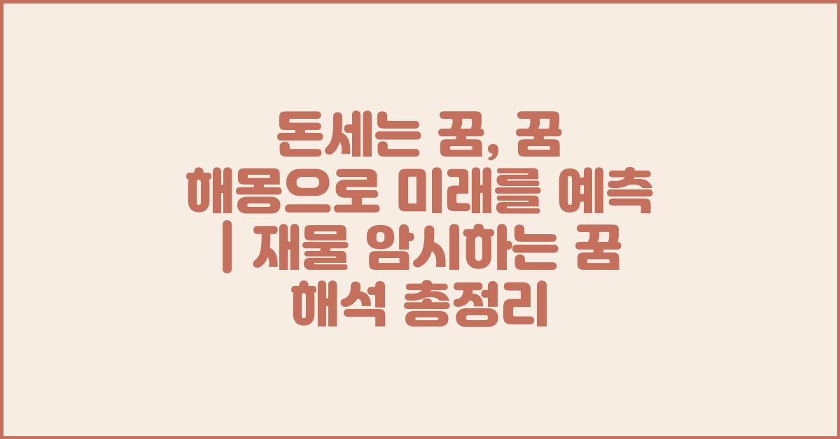 돈세는 꿈: 꿈 해몽으로 미래를 예측 | 꿈해몽 꿈풀이 꿈해석 꿈의미는 많은 사람들에게 관심을 받고 있습니다. 왜냐하면 꿈이 현실에 미치는 영향은 크고, 꿈의 해석을 통해 우리가 놓치고 있는 중요한 통찰력을 발견할 수 있기 때문입니다. 꿈의 해석은 때때로 개인의 감정, 상황, 잠재적인 미래와 깊은 관련이 있습니다. 예를 들어, 돈세는 꿈을 꿨을 때, 단순하게 재무적인 어려움을 시사하는 것일 수도 있지만, 더 나아가 새로운 기회를 나타내는 꿈일 수도 있죠.