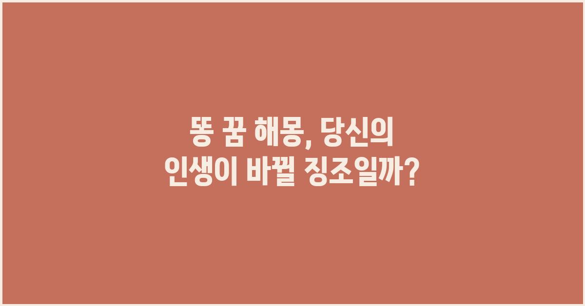 꿈은 단순한 심상의 오류가 아닌, 우리의 무의식과 깊이 연결된 신호입니다. 특히 똥 꿈 해몽은 다양한 해석을 가지고 있으며, 종종 우리가 마주하는 문제나 감정과 관련이 깊습니다. 여러분, 똥 꿈을 꿨을 때 어떤 기분이 드셨나요? 여러 상황 속에서 똥이 상징하는 것들은 사람마다 다르게 해석될 수 있습니다. 꿈은 거짓말을 하지 않는다, 그래서 우리는 이 신호를 적절히 해석해야 합니다.