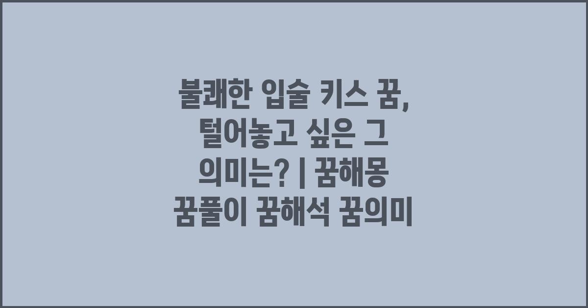 불쾌한 입술 키스 꿈은 우리의 무의식에서 많은 메시지를 전달할 수 있습니다. 꿈에서의 키스는 사랑, 친밀감, 그리고 종종 새로운 시작을 상징합니다. 하지만 불쾌한 느낌이 동반된다면 그 의미는 한층 깊어집니다. 과거의 상처, 감정적 갈등, 또는 현재의 불안감이 반영된 것일 수 있습니다. 여러분도 이런 꿈을 꾼 적이 있으신가요? 이런 꿈을 분석하면서 느꼈던 감정들을 곱씹어보는 것도 좋습니다.