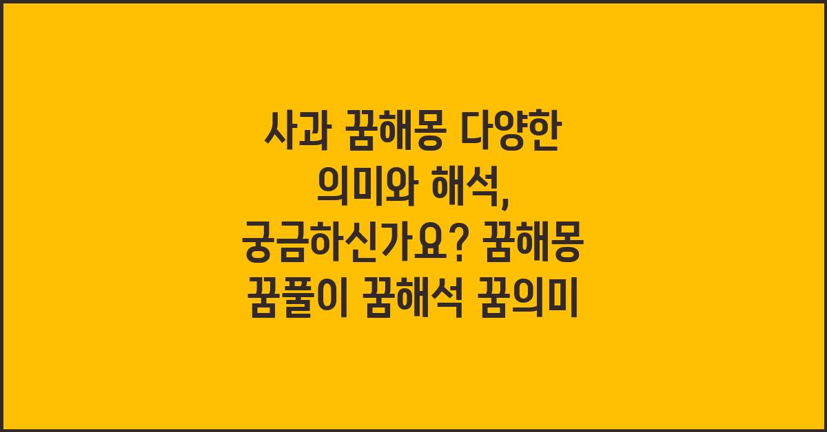 꿈에서 사과는 여러 가지 의미를 지닙니다. 사과는 대체로 사랑, 화해, 그리고 새로운 시작의 상징으로 여겨집니다. 꿈해몽 사과의 의미를 이해하면, 자신의 감정과 현재 상황을 더 잘 파악할 수 있습니다. 개인적으로 생각해보면, 사과는 우리가 일상에서 흔히 접하는 과일이지만 꿈에서는 그 깊은 의미를 품고 있습니다. 꿈에서 사과를 목격했는지, 혹은 사과를 따거나 먹었는지에 따라 해석의 방향성이 달라질 것입니다. 이렇게 사과의 꿈이 관여하는 비유적 의미를 통해 우리가 내면의 고민을 풀어주는 열쇠가 될 수 있죠.